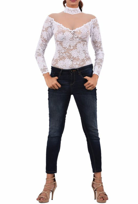 Women Premium Lingerie Full Sleeve Lace Bodysuit White
